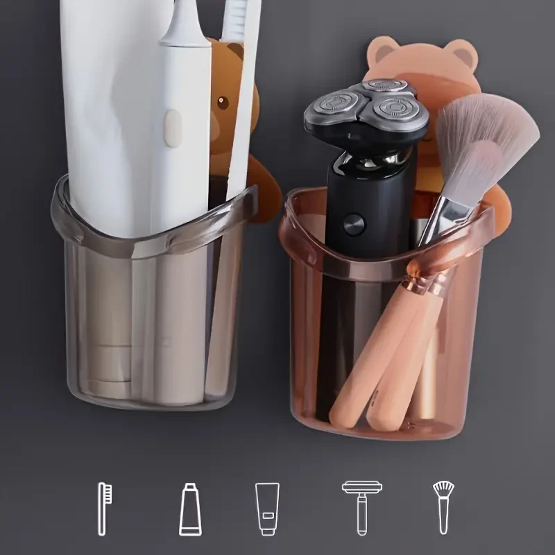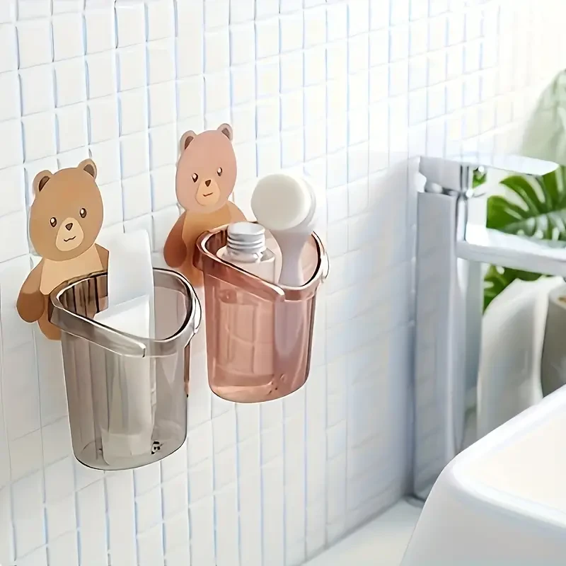 1pc Plastic Cute Bear Storage Cup, Wall Mounted Adhesive Storage Cup, Toothbrush Razor Brush Cosmetics Organizer, Office Home Kitchen Bathroom Storage Holder